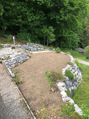 Neue Terrassierung umgeben mit Wimmiser Alpenkalk. Einheimische Stauden geben die farbigen Töne dazu.
