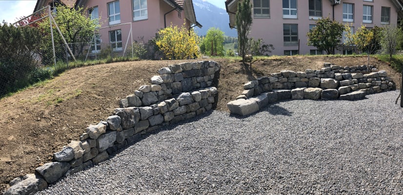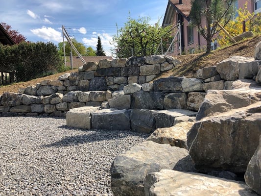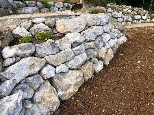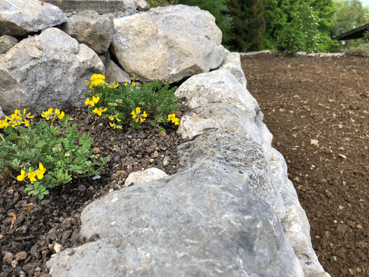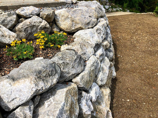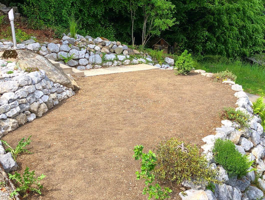 Naturnahe Gartenumgestaltung mit Trockenmauern aus Alpen-Kalkstein aus dem Kandertal
